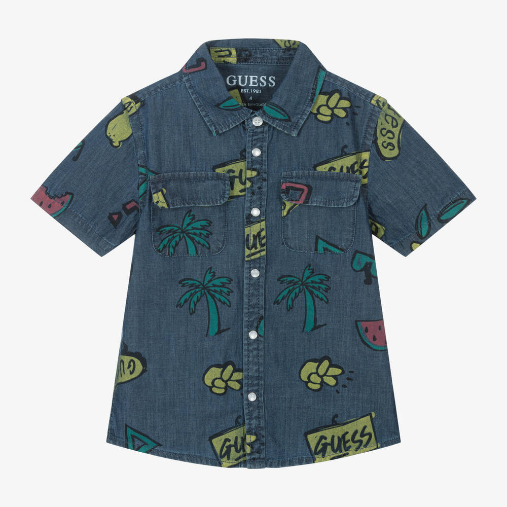 A blue chambray shirt for younger boys by American band Guess, made in lightweight cotton. Patterned in colourful fruit and logo prints, this casual shirt has a pointed collar and two flap pockets on the chest. There are pearlescent poppers down the front for easy fastening.