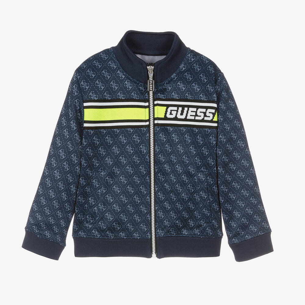 A navy blue zip-up top for boys by American brand Guess, made in silky soft recycled jersey. This track-style top has an all-over 4g design, with a bright yellow and white jacquard logo across the chest for sporty styling. Side seam pockets and a ribbed high neck offer a casual finish.