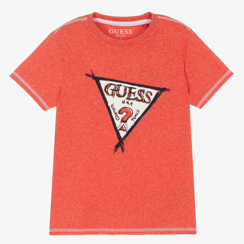 Pale red slub T-shirt for junior boys from Guess. Made in stretchy cotton-mix jersey, it has the iconic white Triangle logo print with edgy black embroidery on the front. It is detailed with contrast white stitching for a cool effect.