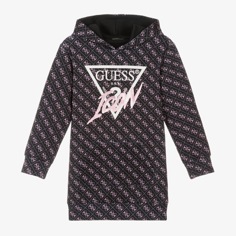 Striking black hoodie-style dress for girls by American brand Guess, patterned with the label's 4g logo in pink. Made in soft, smooth jersey, it has the signature Triangle logo printed on the front in white, with 'Icon' printed across it in pink. There is a useful pouch pocket on the front and a lining in the hood for comfort. This dress contains recycled plastic.