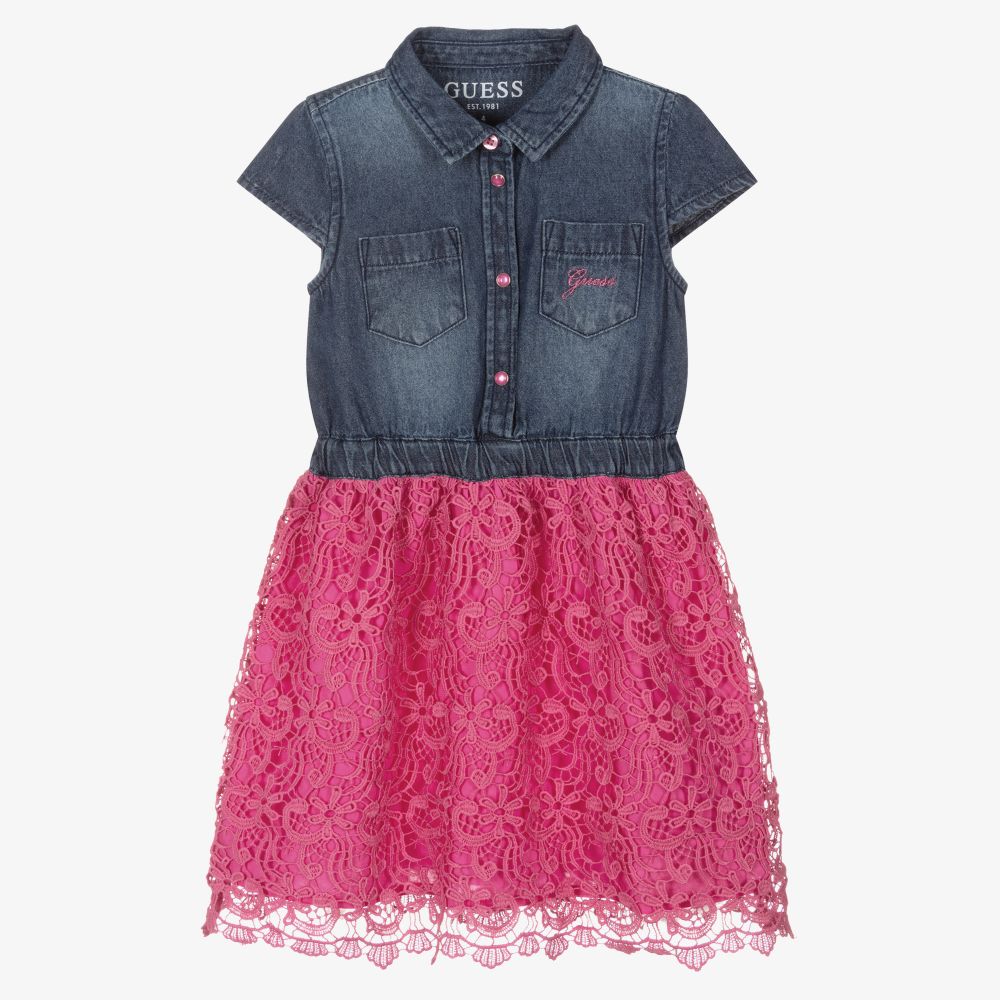 Girls blue and pink dress by American brand Guess. The bodice is made in soft blue denim with pink button and popper fastenings. It has sweet capped sleeves and an embroidered logo on the chest pocket. The skirt is made in fuschia pink lace and lined in soft cotton voile. There is an elasticated waistband.