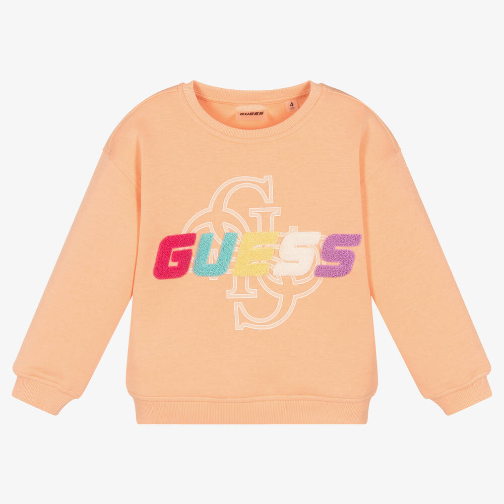 Mini-me pastel orange sweatshirt for girls by American brand, Guess. It is printed on the front with the designer's 4g logo, beneath an appliqué logo design in colourful bouclé letters. Made in comfortable scuba jersey with a lovely smooth feel, this cotton-blend top has a relaxed fit and classic ribbed trims.