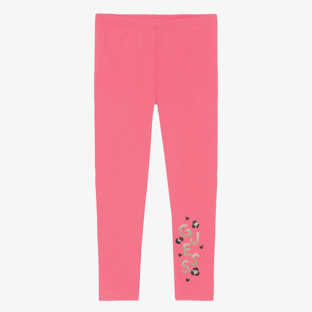 Pink full-length leggings for girls by Guess, with a sparkly gold logo design on one leg. Made in soft and stretchy cotton jersey, these casual leggings have a comfortable elasticated waistband.