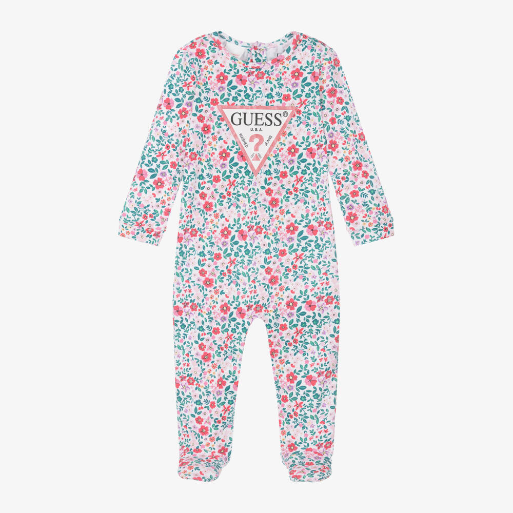 White babygrow for girls by Guess, made in soft and stretchy cotton jersey. It has a pretty pink and green floral pattern and a large Triangle logo on the front for added designer appeal. This sweet babygrow fastens with poppers on the back and between the legs for easy dressing. It comes with a branded gift bag. This item contains organic cotton.