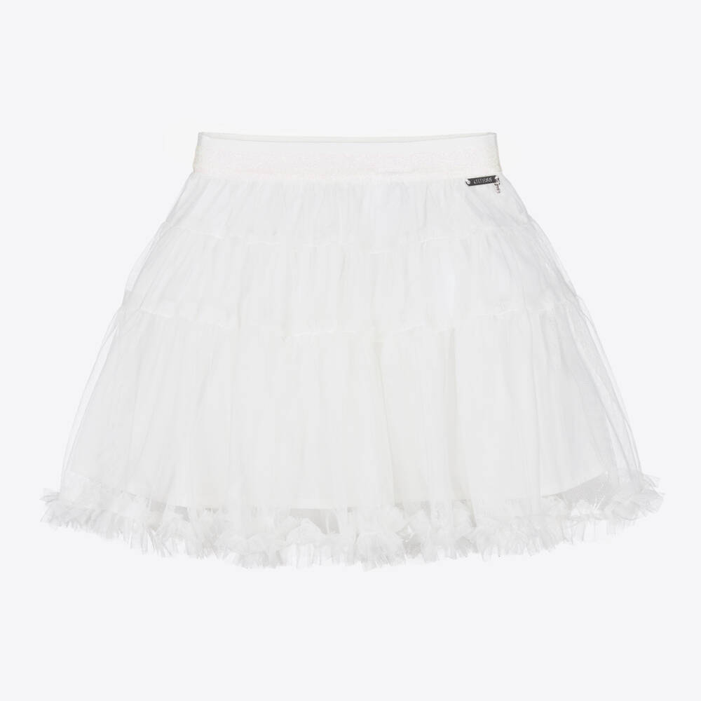 Gorgeous white tutu skirt for girls by Guess, with a silver metal logo plate detail. It is made in soft tulle, cascading in tiers and ruffles for extra bounce. Gentle on little tummies, the softly elasticated waist glitters in iridescent colours for a touch of glamour. This skirt is fully lined with lightweight cotton voile for comfort.