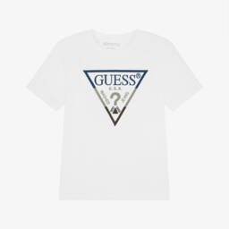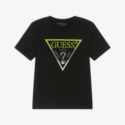 Black organic cotton T-shirt for junior boys by Guess, with the brand's iconic Triangle logo embroidered on the front in green, grey and white. Cool and casual, this short-sleeved tee is made in soft jersey for comfortable wear.