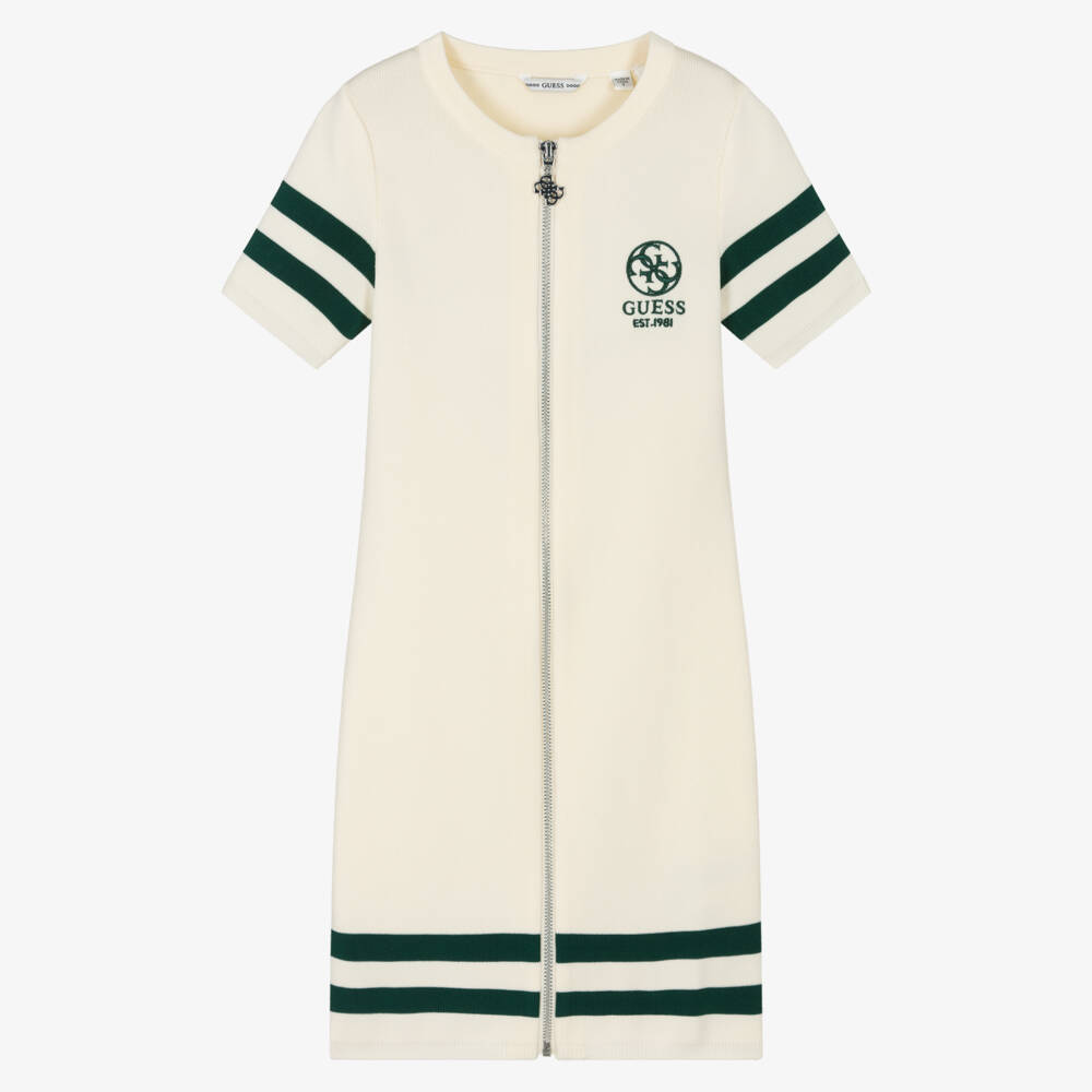 Sleek and stylish ivory dress for junior girls by Guess, made in a soft and stretchy, ribbed viscose blend. Fastening with a full-length zip, this fitted style has contrasting green stripes on the sleeves and hem. A coordinating green 4g logo is embroidered on the chest for instant designer appeal.