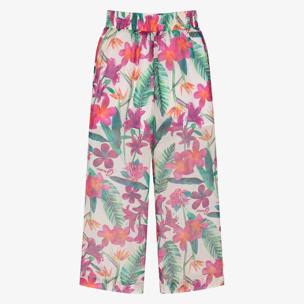 Vibrant, tropical floral print trousers for girls by Guess, in pink, green and ivory. Made in sheer chiffon with a partial lining, the elasticated waistband ensures a comfortable fit, making them ideal for any occasion.
