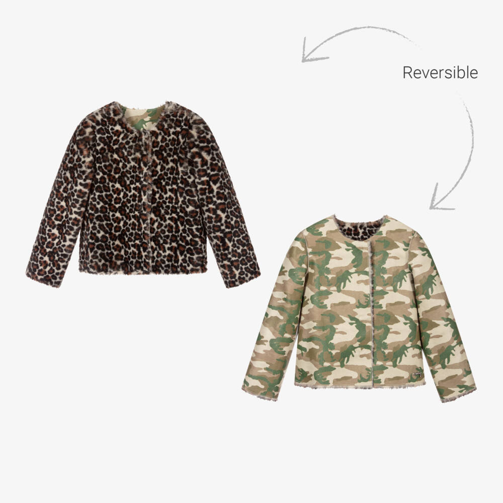 Reversible jacket for girls by Guess. One side is soft faux fur in brown leopard, and the other has a green camouflage print. The coat has large popper fastenings down the front and concealed pockets that can be used both ways. Both sides have a rounded neck and feature a small silver logo plate with a diamanté charm.