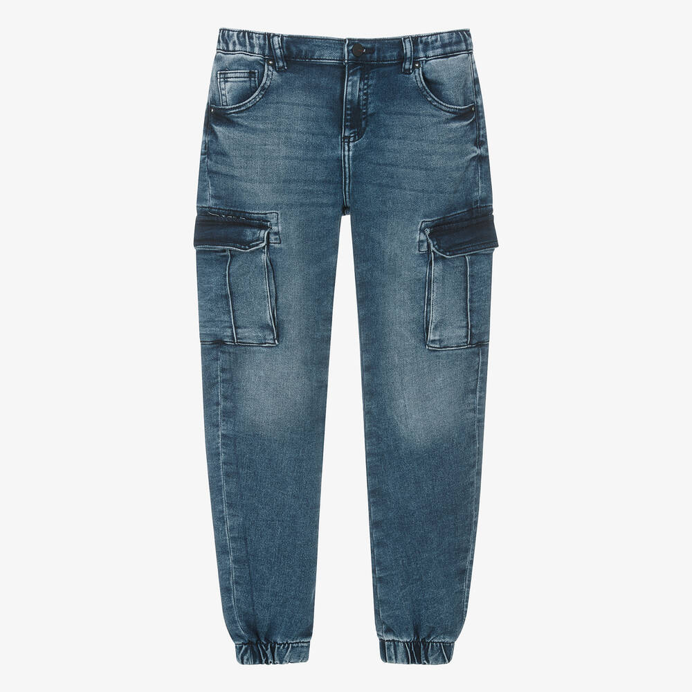 Fusing iconic casual styles for teen boys, these comfortable blue jeans are from American brand, Guess. For discreet designer appeal, they have logo branding on the rivets and button. Made in soft cotton jersey denim with intentional fading, they have popper cargo pockets on the legs and a relaxed jogger shape with cuffed ankles. The waistband is elasticated and they fasten with a zip and button, with belt loops for a great fit.