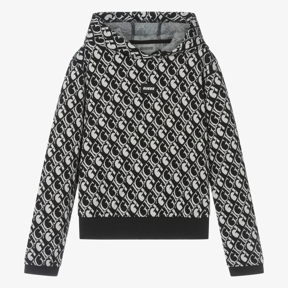 Effortlessly cool, this black and pale grey hoodie for teen girls is by Guess. Embellished with a rubberised logo patch on the chest, it has a jacquard monogram pattern for an instantly recognisable look. Made from a soft and stretchy viscose-blended knit, this long-sleeved top has black ribbed trims for a casual finish. This item contains recycled plastic.