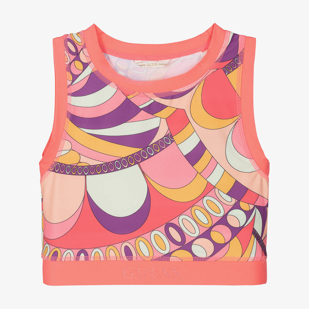 Vibrant sporty crop top for teen girls by Guess, with a bold psychedelic pattern in shades of pink and purple. Silky smooth and stretchy, this comfortable sleeveless top has an elasticated band with the brand's logo print in glittery pink letters for added sparkle.
