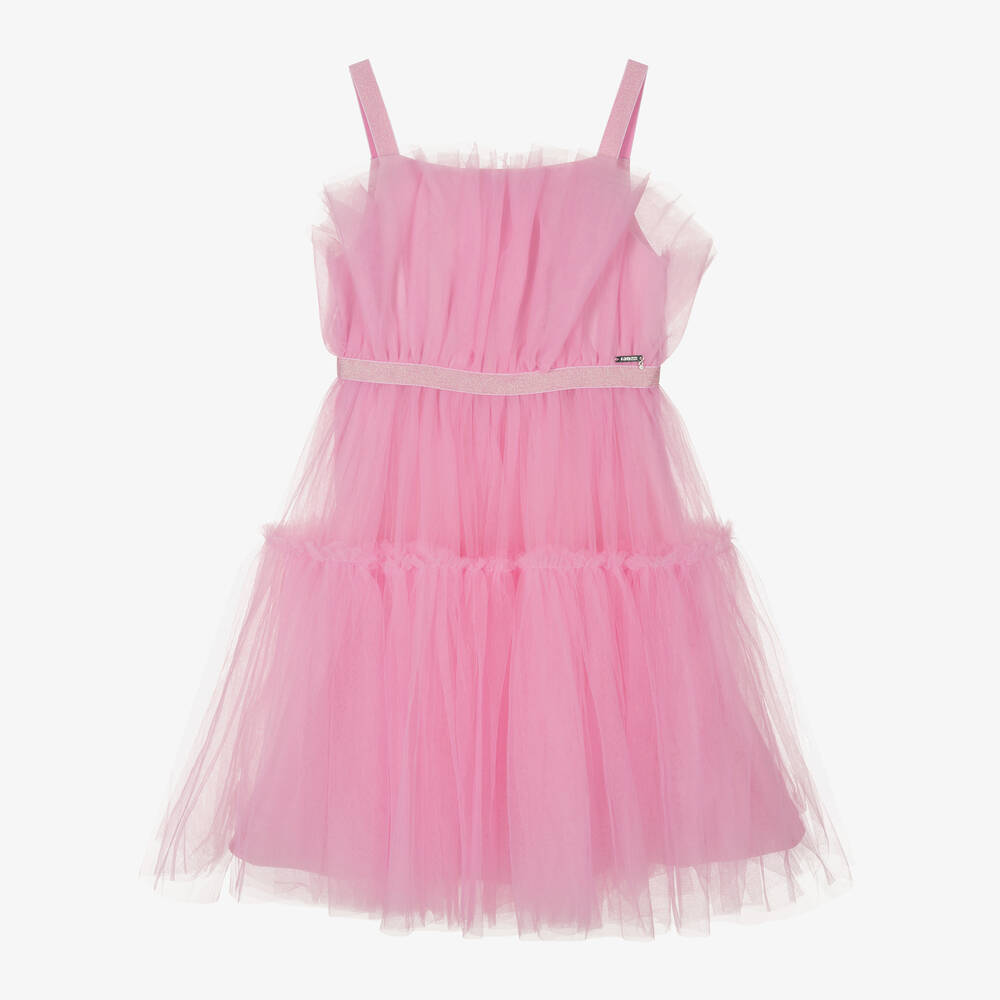 Gorgeous pink dress for teen girls by Guess, with a silver metal logo charm on the waist. Ideal for a special occasion, it is made in layers of soft tulle and has a tiered skirt and a glittery pink waistband. There are matching glittery pink shoulder straps, which are elasticated for comfort and a lightweight lining. It fastens with a concealed zip on the back.
