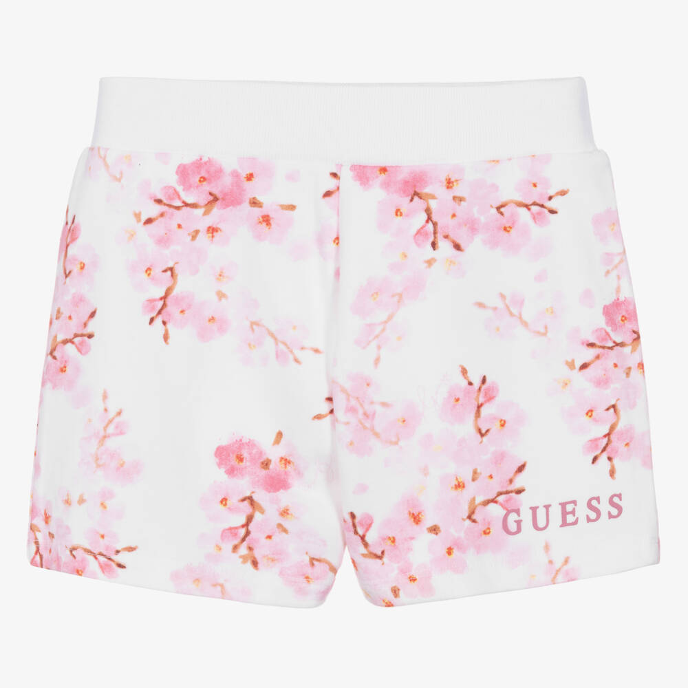 White shorts for teen girls by Guess, with a mauve purple rubber logo on one leg for a casual designer statement. Cool and comfortable, they have a pretty pink cherry blossom pattern and a ribbed, elasticated waistband. They are made in soft and stretchy cotton sweatshirt jersey.