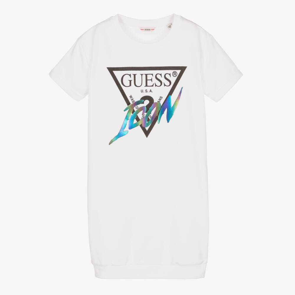 Girls white cotton dress by American brand Guess. This cool piece is made in soft and stretchy, mid-weight jersey, with the designer's signature black Triangle logo and an iridescent 'Icon' slogan stamped on the front. Easy to slip on over the head, it has fixed turn-up cuffs and a ribbed crew neckline and hem for a casual, relaxed style. This dress contains organic cotton fibres.