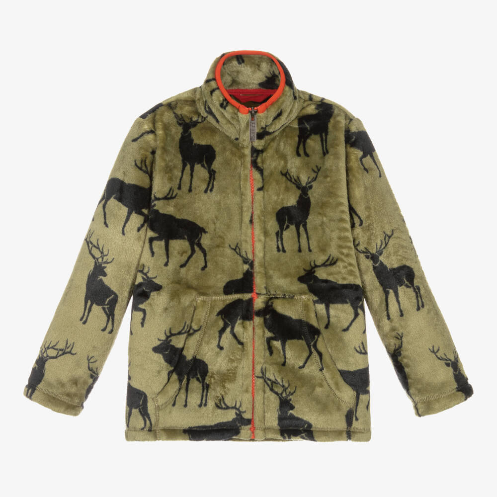 Dark green zip-up top for boys by Canadian brand Hatley, made in super soft fleece. With an exposed orange zip on the front, this cosy layer is patterned with black deer silhouettes. A versatile piece, it has a high collar with an orange trim and pouch pockets on the front to keep little hands warm.