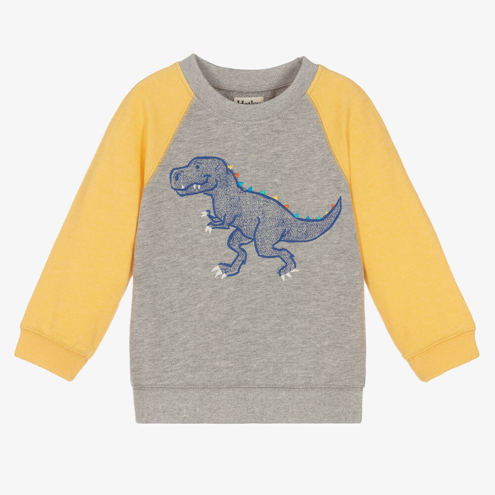 Grey marl and yellow sweatshirt for boys by Hatley, made from a soft and lightweight cotton jersey. This casual crew neck has a quirky textured T-Rex print on the front, with colourful embroidered spikes for a fun and playful finish. The neckline and cuffs are softly ribbed for a comfortable and cosy fit.