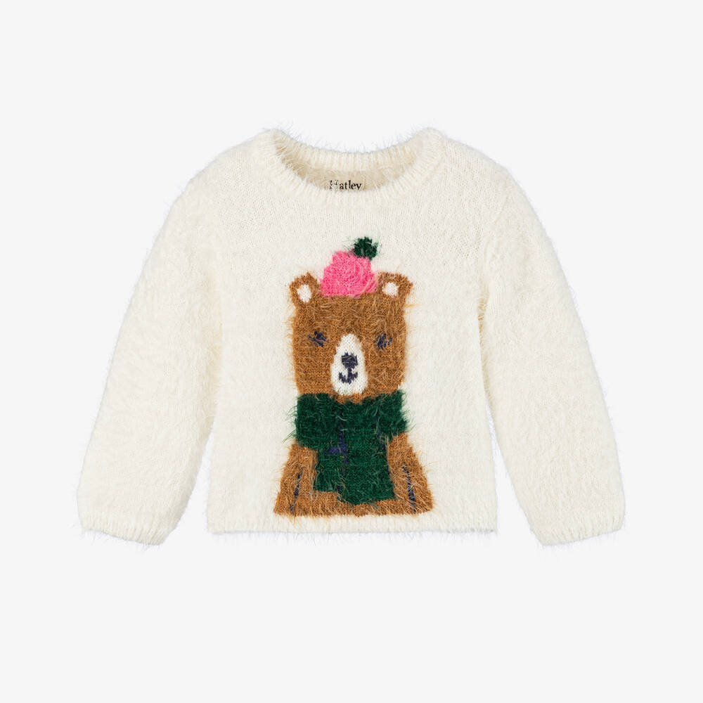 A beautifully soft and fluffy ivory sweater for little girls by Hatley. Cosy and comfortable, it has long sleeves and features an adorable bear motif on the front.