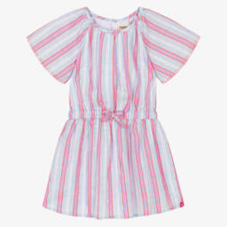 A fun pink and white dress for girls by Hatley. Made in soft cotton jersey, the short-sleeved bodice has a round neckline and gentle gathers on the shoulder for a girly touch. The gold necklace print is decorated with pink and blue tassels, embroidered details and sparkling diamantés. The jersey skirt has a fine tulle overlay and the elasticated tape waistband has a glittery silver, lurex finish.