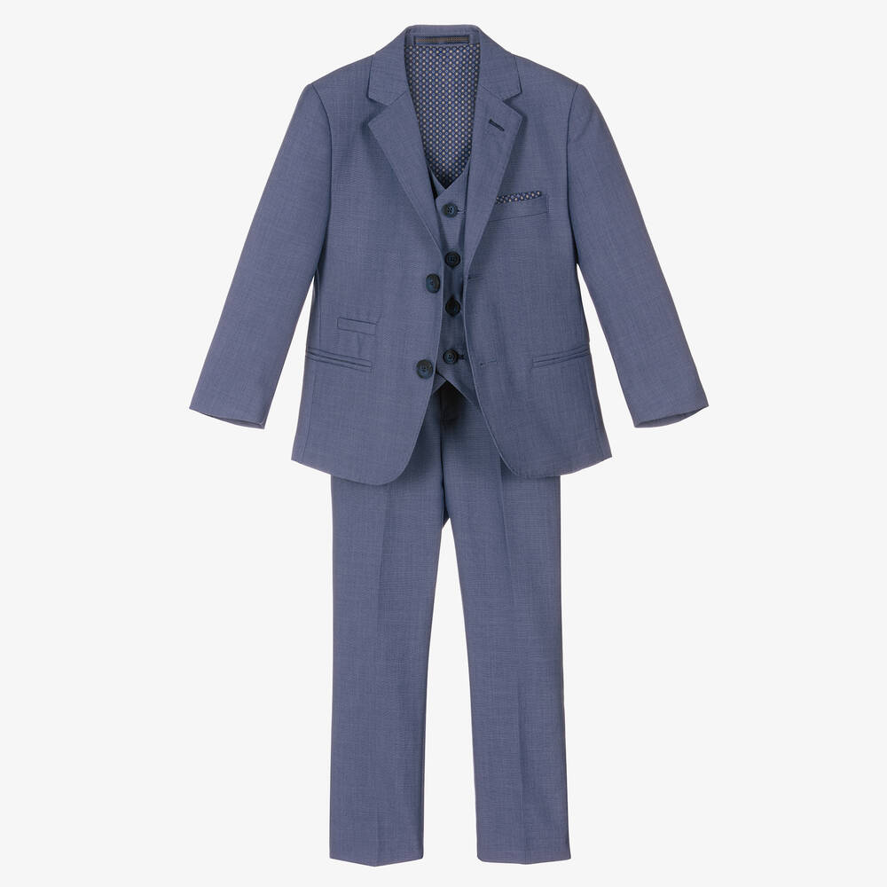 A beautifully tailored three-piece mid-blue Mini-me suit for boys by British brand House of Cavani. All the pieces are made in an elegant and lightweight fabric with classic styling. The jacket has delicate stitching detail on the notch lapel, with internal and external pockets. The trousers have slanted pockets, a buttoned back pocket and a part elasticated waist for a better fit. Both the jacket and waistcoat have a lovely patterned lining for comfort, and there is a fixed pocket square in a matching pattern to complement the look.