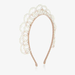 Beautiful glittery, light gold hairband for girls by Hucklebones London. Set on a narrow and flexible, satin-covered ivory band, the oversized bow creates an eye-catching look.
