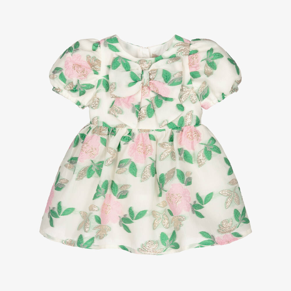 A special occasion ivory jacquard dress for little girls by Hucklebones London. This elegant design is made in delicately woven fabric, with an enchanting floral pattern in pink, green and metallic gold. It features puffed sleeves and a full skirt, with a charming bow detail on the front. Lined in comfortable cotton with a tulle underskirt, the dress comes with a pair of matching knickers to completes the look.