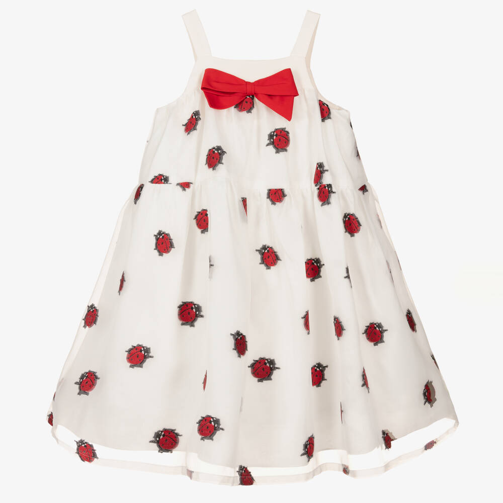 Gorgeous white organza dress for girls by Hucklebones London. In a puffed style, it has cute red ladybirds embroidered all-over and a twill bow on the front. Fastening on the back with two gold buttons, it has a white silky underlayer and a soft voile lining for comfort on the skin.