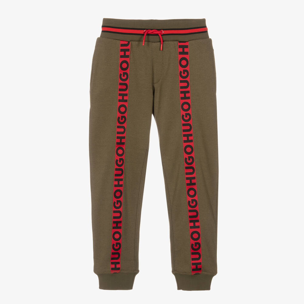 From luxury brand HUGO, a pair of khaki green joggers for boys. The designer's distinctive red and black logo tape detailing runs from the elasticated waist to the cuffs. These comfortable bottoms are made in soft and stretchy, mid-weight piqué, with handy front pockets and a branded drawstring on the waist.