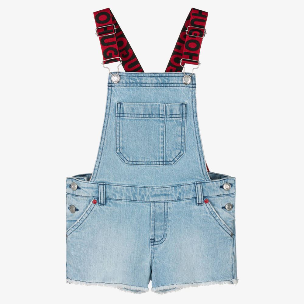 Light blue dungaree shorts for girls by HUGO, made in soft denim. The adjustable shoulder straps are elasticated and have a red and black jacquard logo pattern. There are button fastenings on the sides, a front patch pocket on the bib and stylish frayed hems. For an added designer touch, there is a black and red rubber logo jacron on the back.