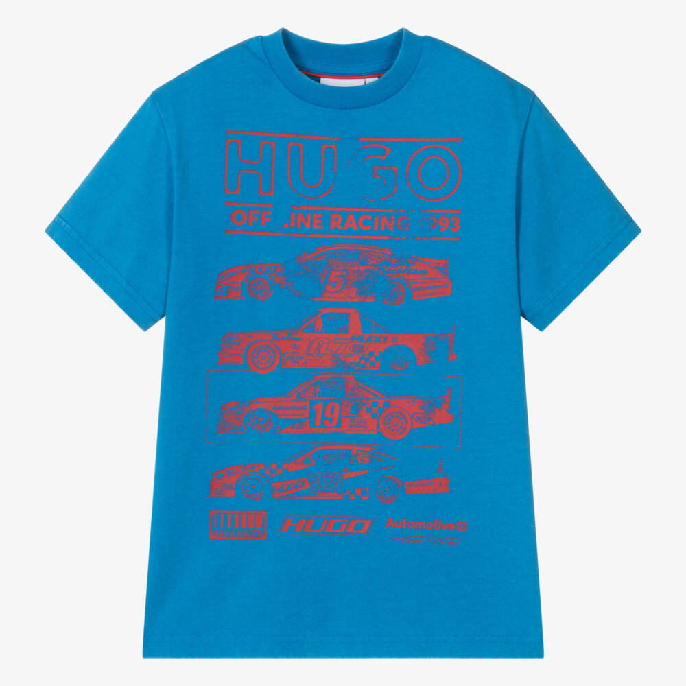 Bold washed blue organic cotton jersey T-shirt by HUGO, cool for teen boys who love motorsport. In the brand's signature red hue, it has a faded racing-inspired logo design for a graphic, sporty look. This short-sleeved top is finished with a crew neck and dropped shoulders. This item contains a minimum of 60% organic cotton.