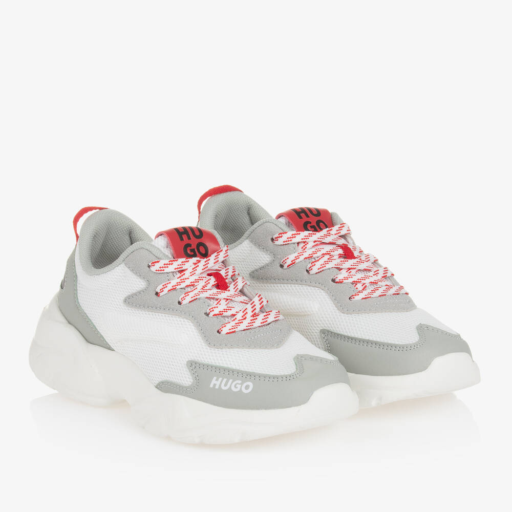 Grey and white trainers for teen boys by HUGO, with signature red branding on the tongue. Great for casual dressing, these especially lightweight trainers have mesh uppers with smooth faux leather and faux suede panels. They fasten with red and white laces and feature further branding on the toe and the back of the heel. They have a comfortable mesh lining, a cushioned insole and a handy red loop on the back. The chunky non-slip sole has a patterned tread and gives this sporty style an effortless, athleisure look.