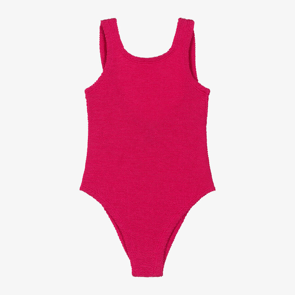 A gorgeous fuchsia pink swimsuit for older girls by British brand Hunza G, in their iconic Original Crinkle fabric. This classic one-piece has a scooped back with a white bow appliqué adding a pretty touch. For lasting wear, the material offers effortless stretch, allowing the swimsuit to grow with your child.