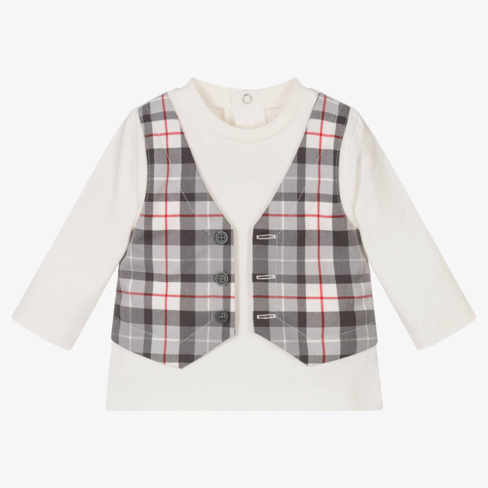 An ivory cotton top for baby boys by iDO Mini, made in super-soft jersey. Designed to appear as a top and waistcoat, it has an attached woven panel in grey and red check with decorative buttons for a smart look. It fastens with easy-to-use poppers on the back.
