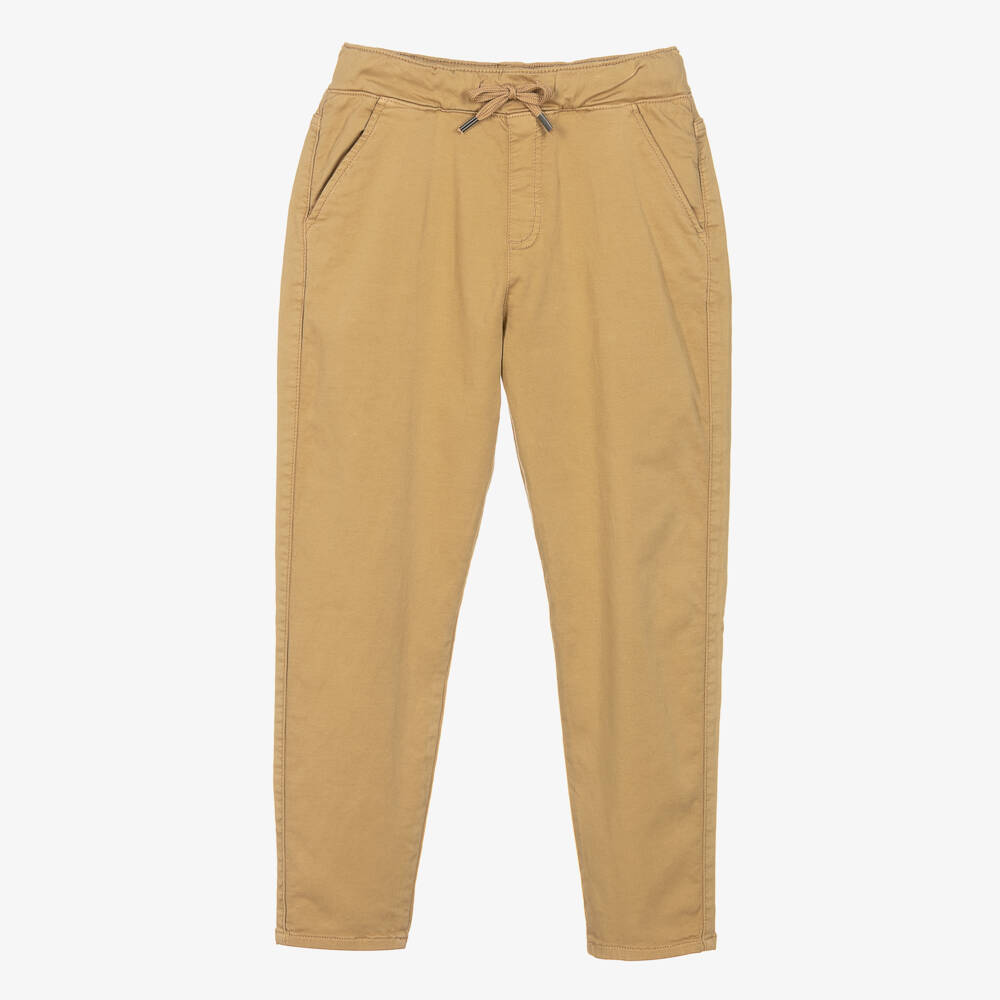 Classic beige cotton trousers for older boys by iDO Junior, with a relaxed, tapered fit. Soft and mid-weight, these trousers have two slanted pockets on the front, and two patch pockets on the back. The drawstring waist is elasticated and adjustable for a comfortable fit.