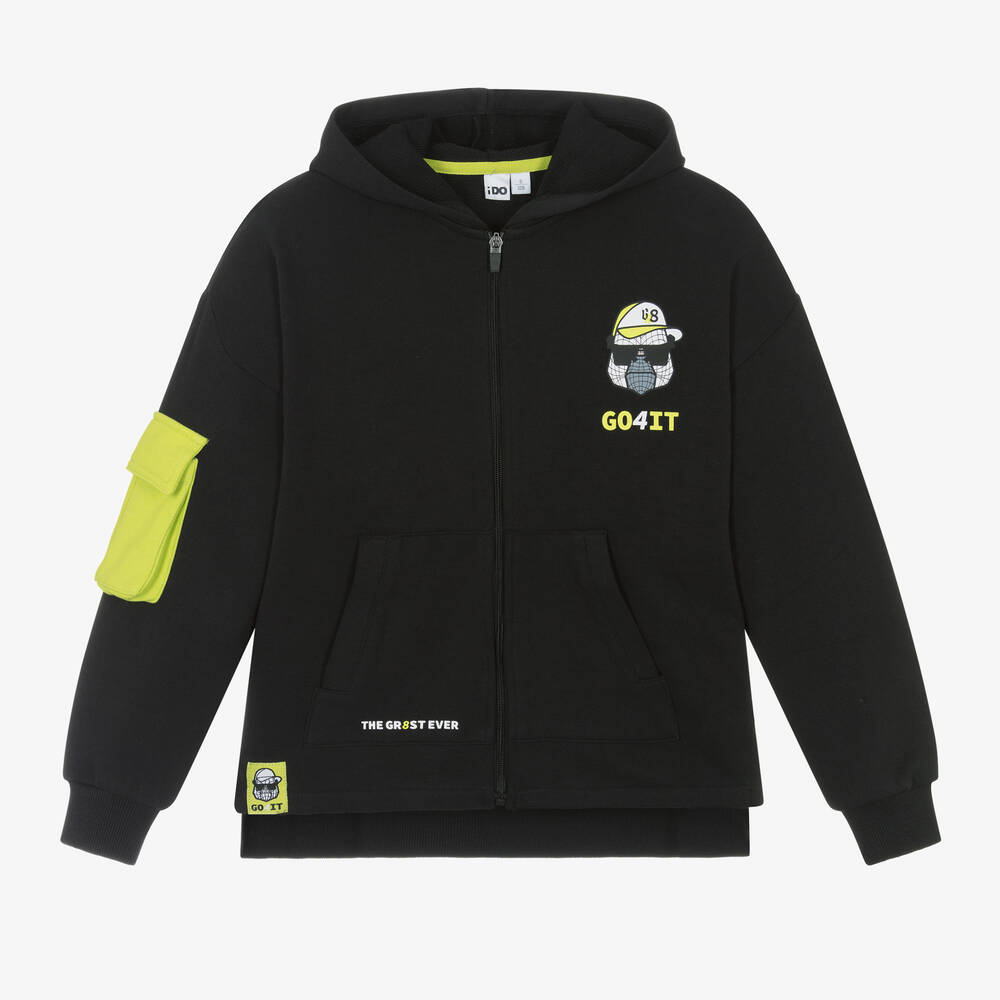 Black hooded zip-up top for older boys by iDO Junior, made in comfortable cotton jersey. Designed in a relaxed fit, this casual piece has cool, street-themed graphics on the front and back. There is a neon yellow flap pocket on one sleeve, useful front pockets and a split hemline, which is longer on the back.