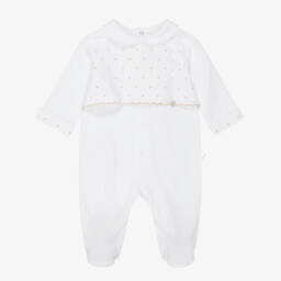 Cute blue babygrow for boys by iDO Mini, made in soft and comfortable cotton jersey. Designed to look like dungarees and a stripy top, this cute one-piece has an adorable teddy bear appliqué on the front. It fastens with poppers on the back and between the legs for quick dressing.