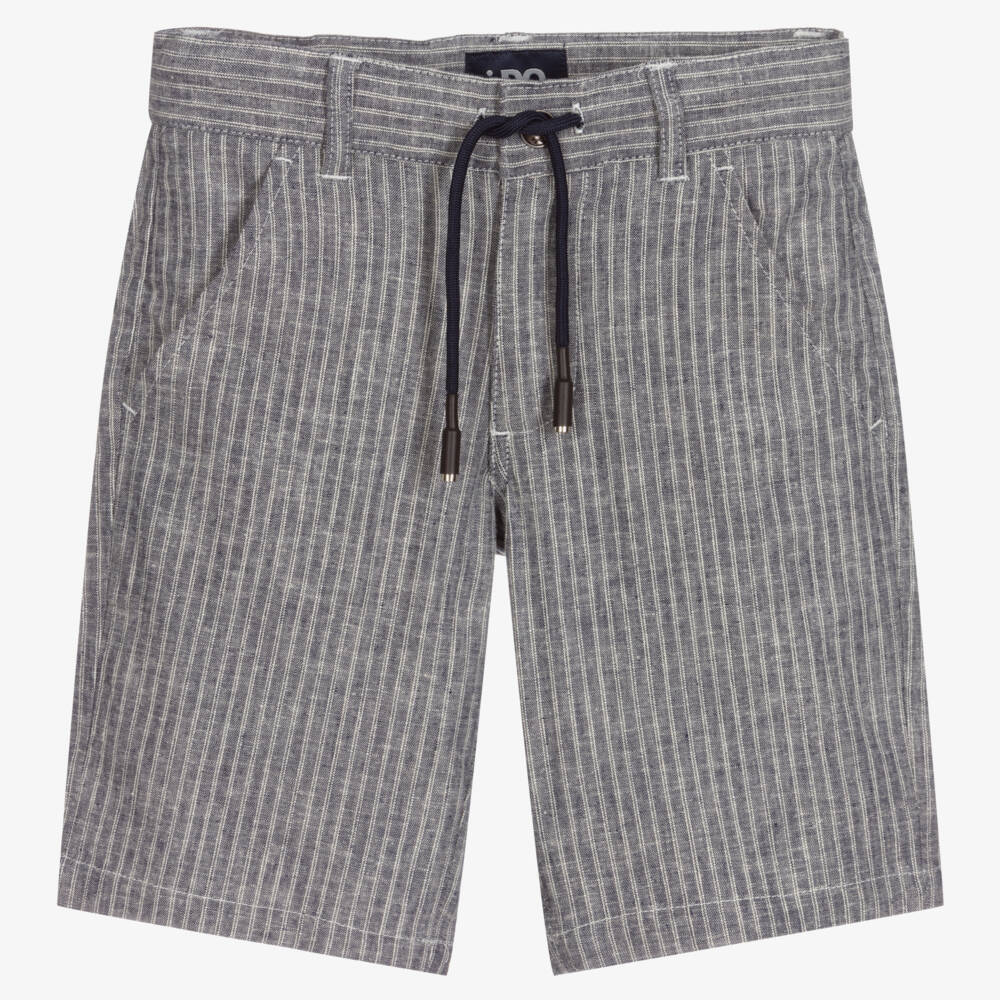 Blue striped slim-fit shorts for little boys by iDO Baby. Soft and lightweight, they are made in a linen and viscose blend weave with slight stretch. They have a hook and eye fastening with a zip and branded drawstrings on the front for a great fit. There are front pockets, an adjustable waist and a logo tab stitched above the faux back pocket.
