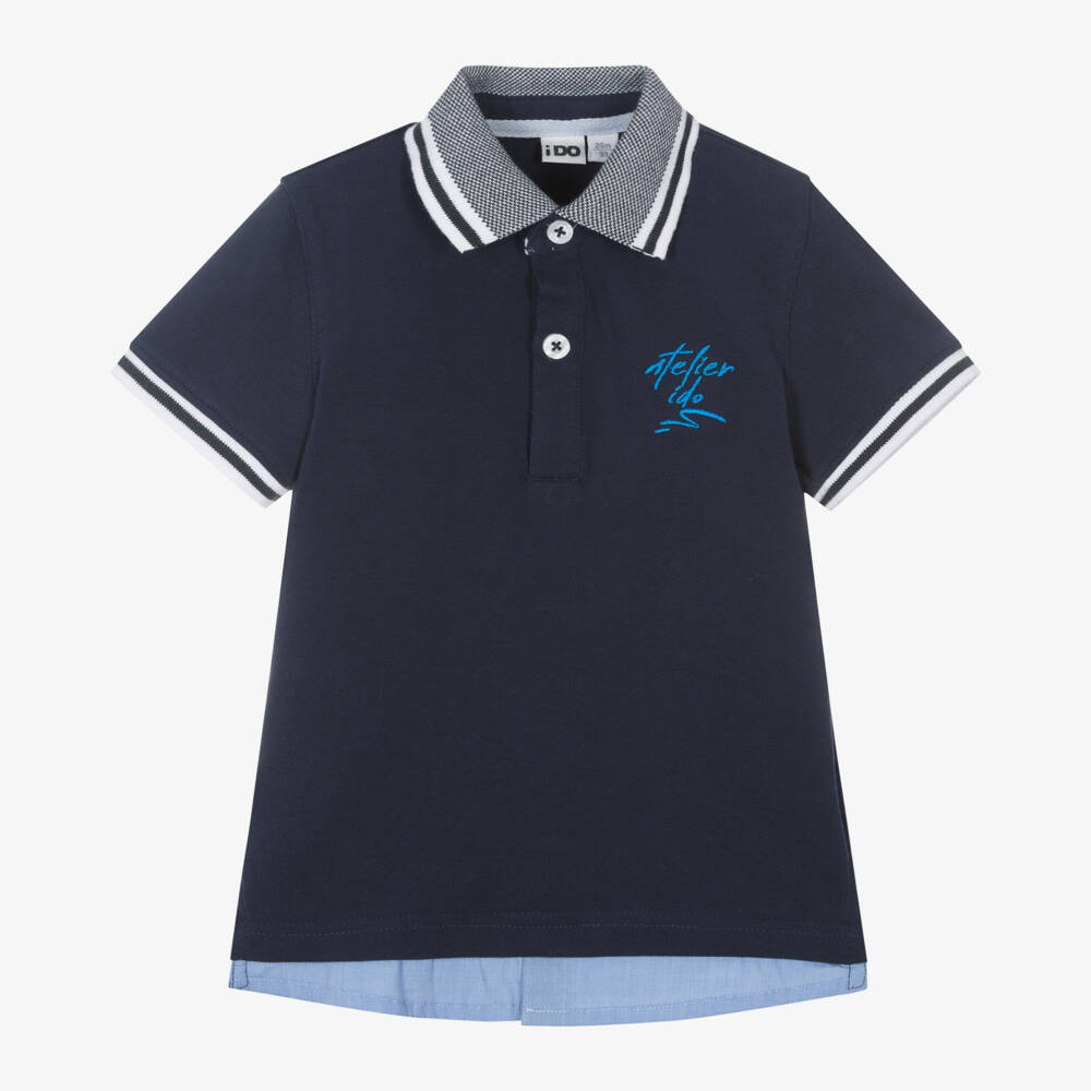 Navy blue polo shirt for boys by iDO Baby, made in soft and stretchy cotton piqué with sporty striped trims on the collar and cuffs. Easy to style, this casual short-sleeved top has a buttoned placket and logo branding embroidered on the chest in a brighter shade of blue. It has a layered look hem and split side vents for ease of movement.