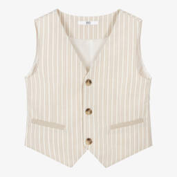 Бежевый жилет для девочек от iDO с традиционным узором косичкой. Связан из мягкого хлопка с добавлением теплой шерсти, имеет V-образный вырез с яркими розовыми и синими полосатыми отделками, добавляющими яркий акцент.