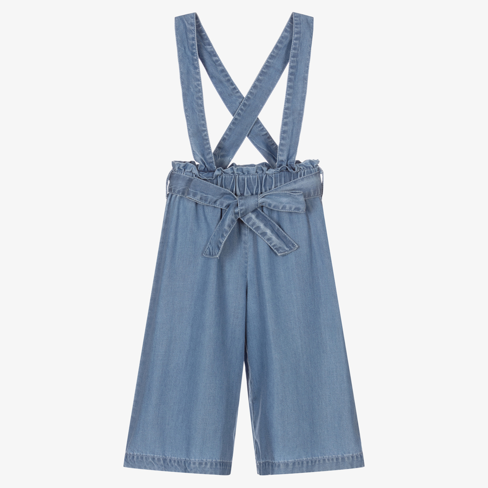Little girls blue chambray trousers by iDO Baby. Soft and lightweight, these wide leg trousers fasten with a tie on the front. The waist is stretchy and the shoulder straps are adjustable with buttons for a comfortable fit.