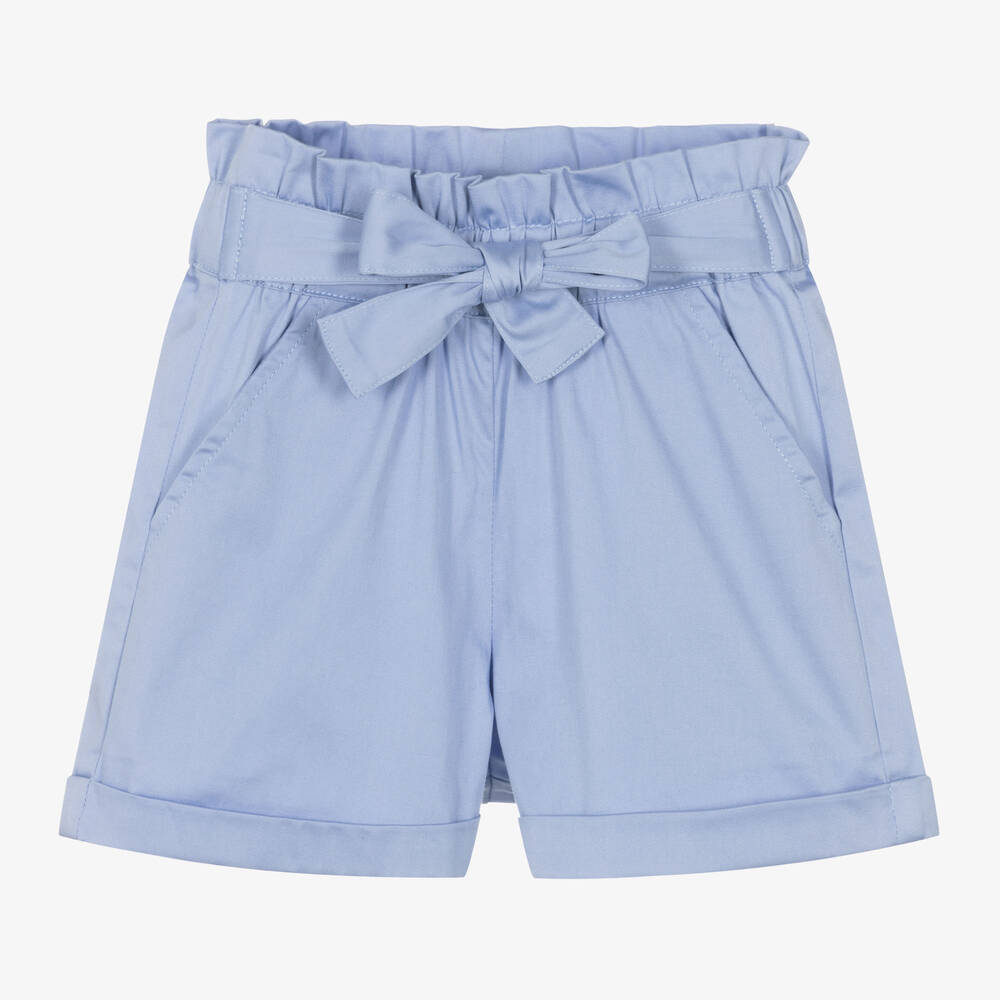 In a lovely shade of cornflower blue, these shorts for girls by iDO Baby are made in soft and lightweight cotton. Designed with turn-up hems, they have useful slanted pockets on the front adding to the casual look. There is a pretty ruffle trim on the comfortable elasticated waistband and a fixed sash on the front that ties into a pretty bow.