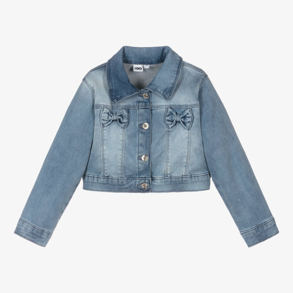 A cropped blue jacket for girls by iDO Junior, made from washed, stretchy cotton denim. This classic design has a pointed collar, branded button fastenings and buttoned cuffs. There are two tonal bows on the chest for added charm.