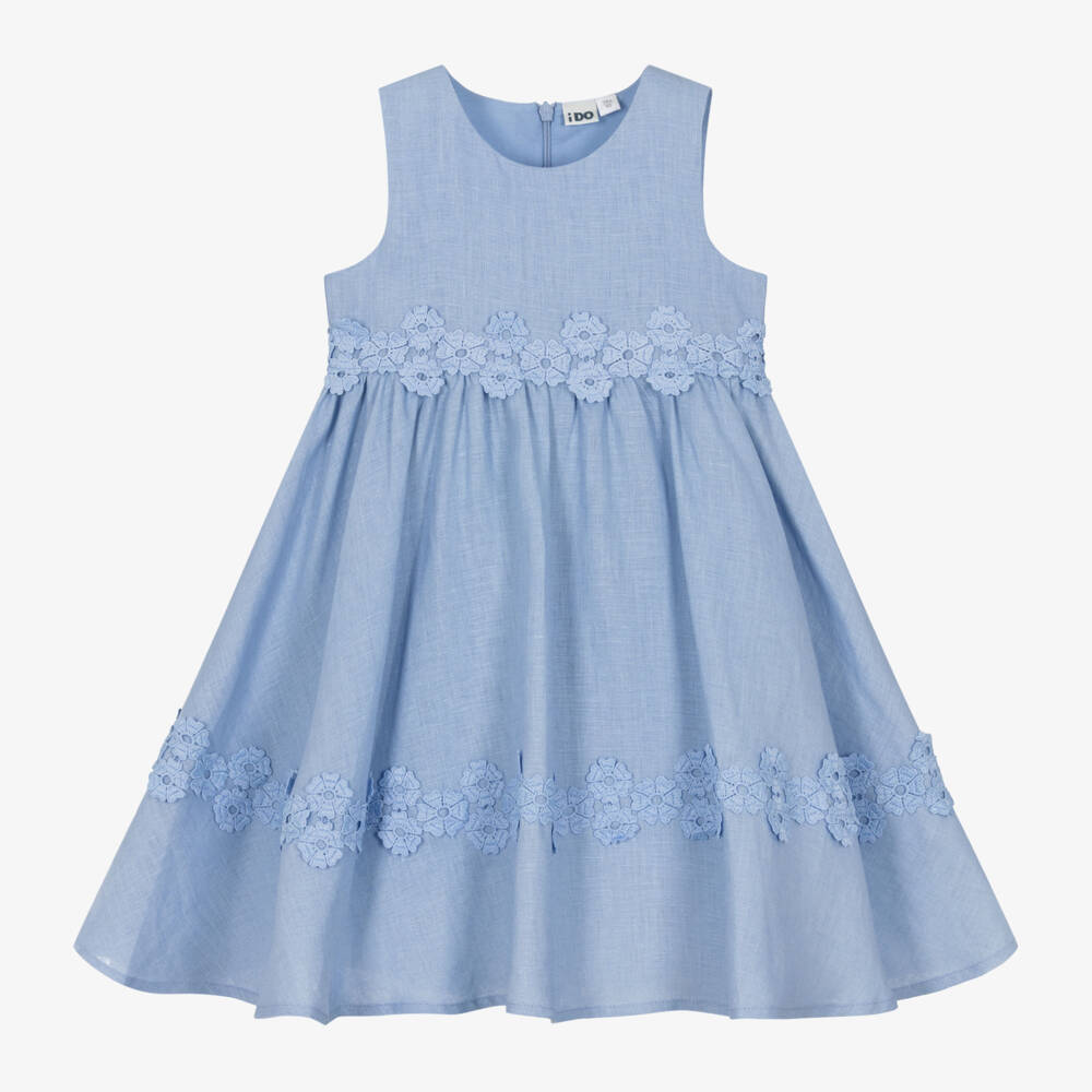 Made in soft linen, this cornflower blue dress for girls is by iDO Baby. In a classic sleeveless design, this pretty dress has gorgeous floral appliqués decorating both the waist and full skirt. It is fully lined in cotton voile for comfort and fastens neatly on the back with a concealed zip.