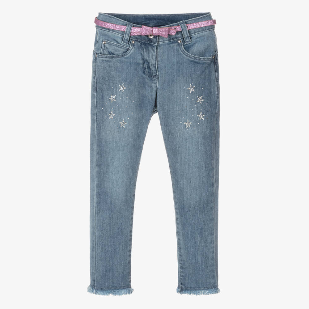 Pretty washed blue jeans for girls by iDO Baby, made in soft stretch denim. They are embellished with silver star diamantés on each leg for a sparkly look. Fastening with a button and zip, they come with a glittery pink belt with a bow on the front and have frayed hems for a stylish, laidback feel.