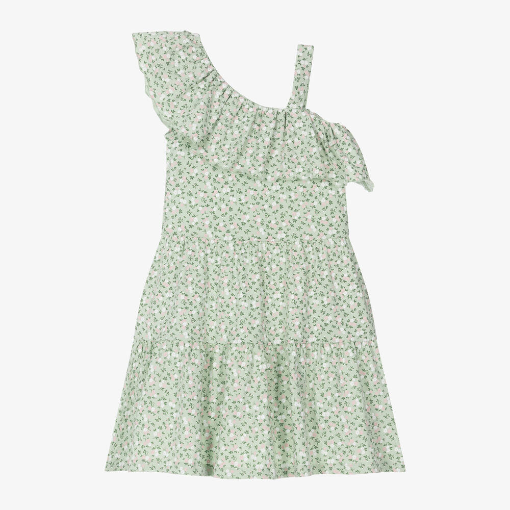 Pretty green summery dress for girls by Italian brand iDO Junior, with a pink and white floral print. Made in soft, comfortable jersey, it has a deep ruffle around the bodice and over one shoulder, with an asymmetric strap on the other side. The gathered skirt has a deep ruffle around the hemline.