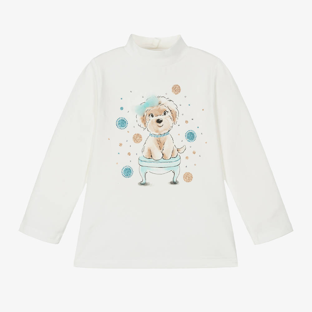 An ivory cotton top for girls by iDO Baby, with a turtleneck-style collar. Sparkling with gold, brown and blue glitter accents, this pretty top has an adorable puppy dog with diamanté and a tulle bow on the front. It is made from soft jersey and fastens with buttons on the back.