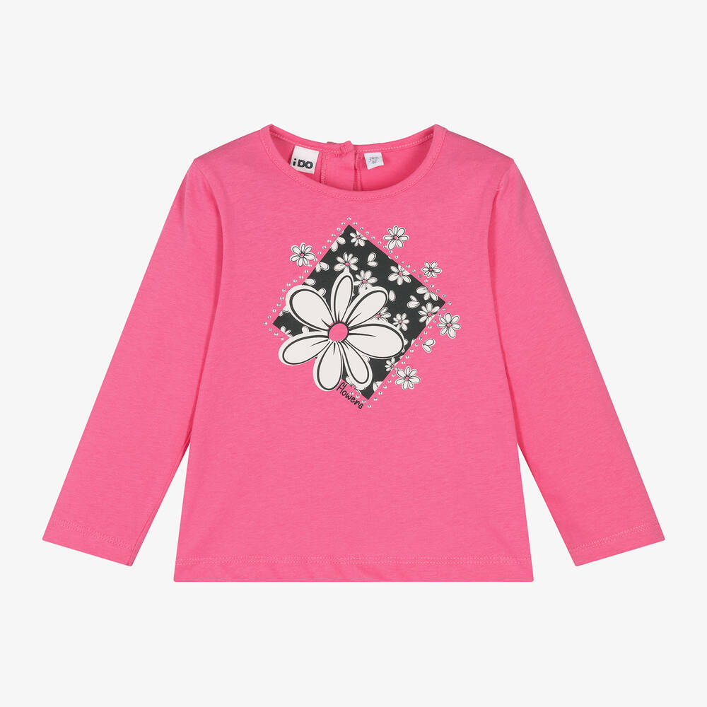Bright pink top for girls by iDO Baby, made in comfortable cotton jersey. It has a pretty flower motif in black and white on the front, detailed with sparkly diamanté. It fastens with buttons on the back.