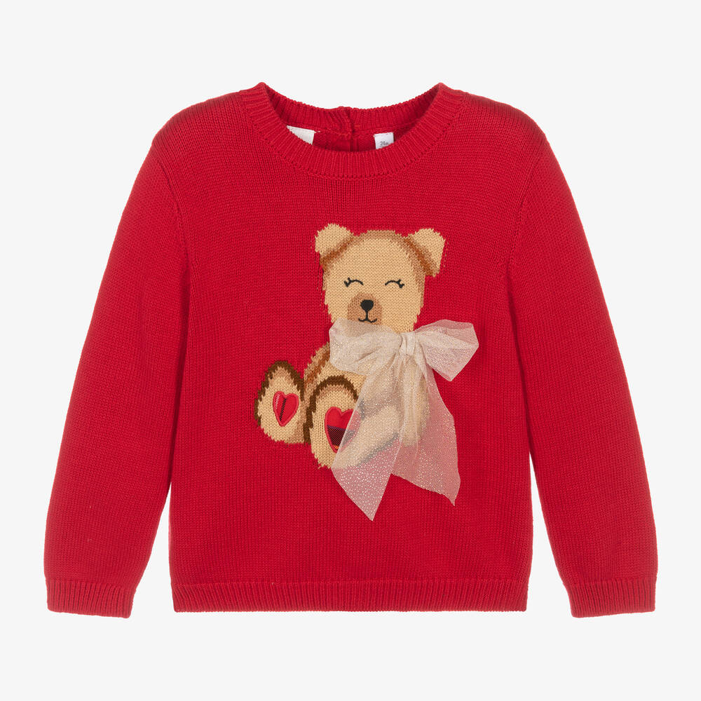 In a bold red shade, this long-sleeved jumper for girls is by iDO Baby. It is knitted in a soft cotton and wool blend, with an adorable jacquard teddy bear on the chest and an appliqué gold sparkly tulle bow. It has ribbed trims for a casual finish.