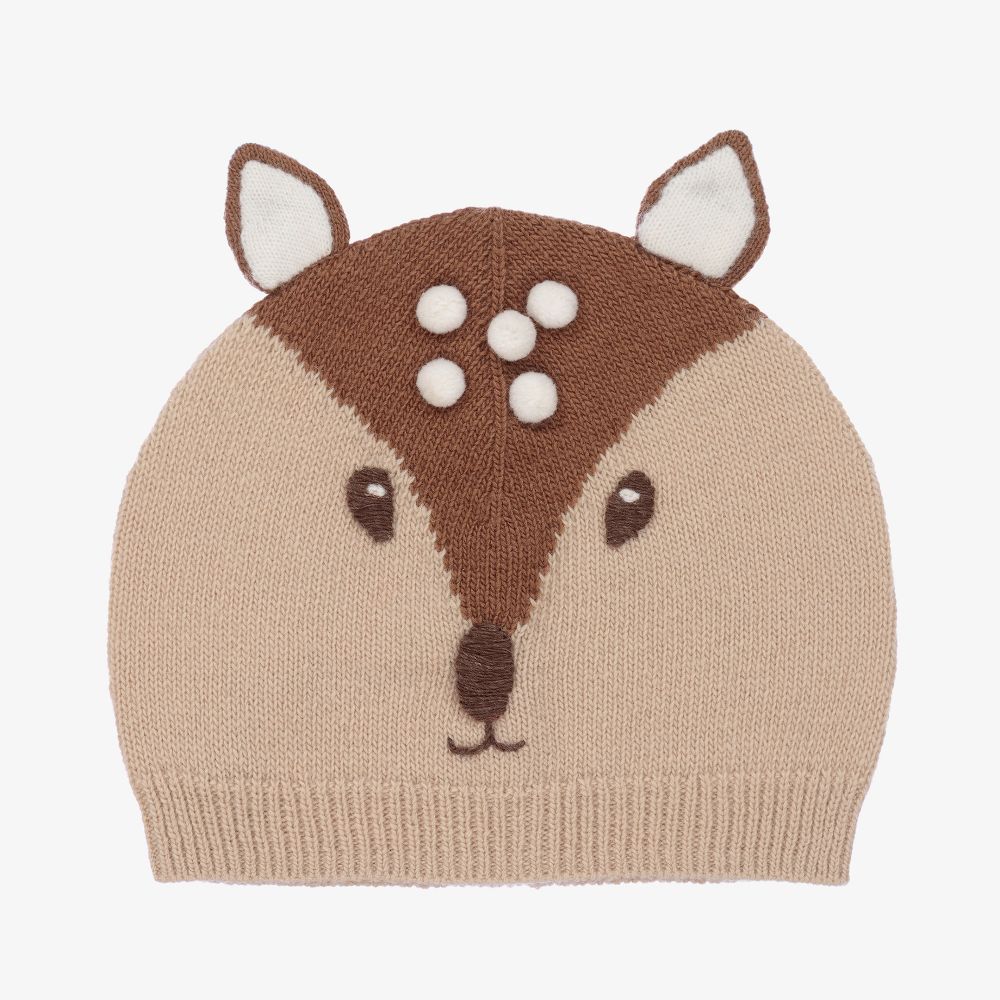 Beige wool knit hat for little boys and girls by Italian luxury brand Il Gufo. Soft and stretchy, it has a cute deer face embroidered on the front, with soft ivory pom-poms and adorable 3D ears.
