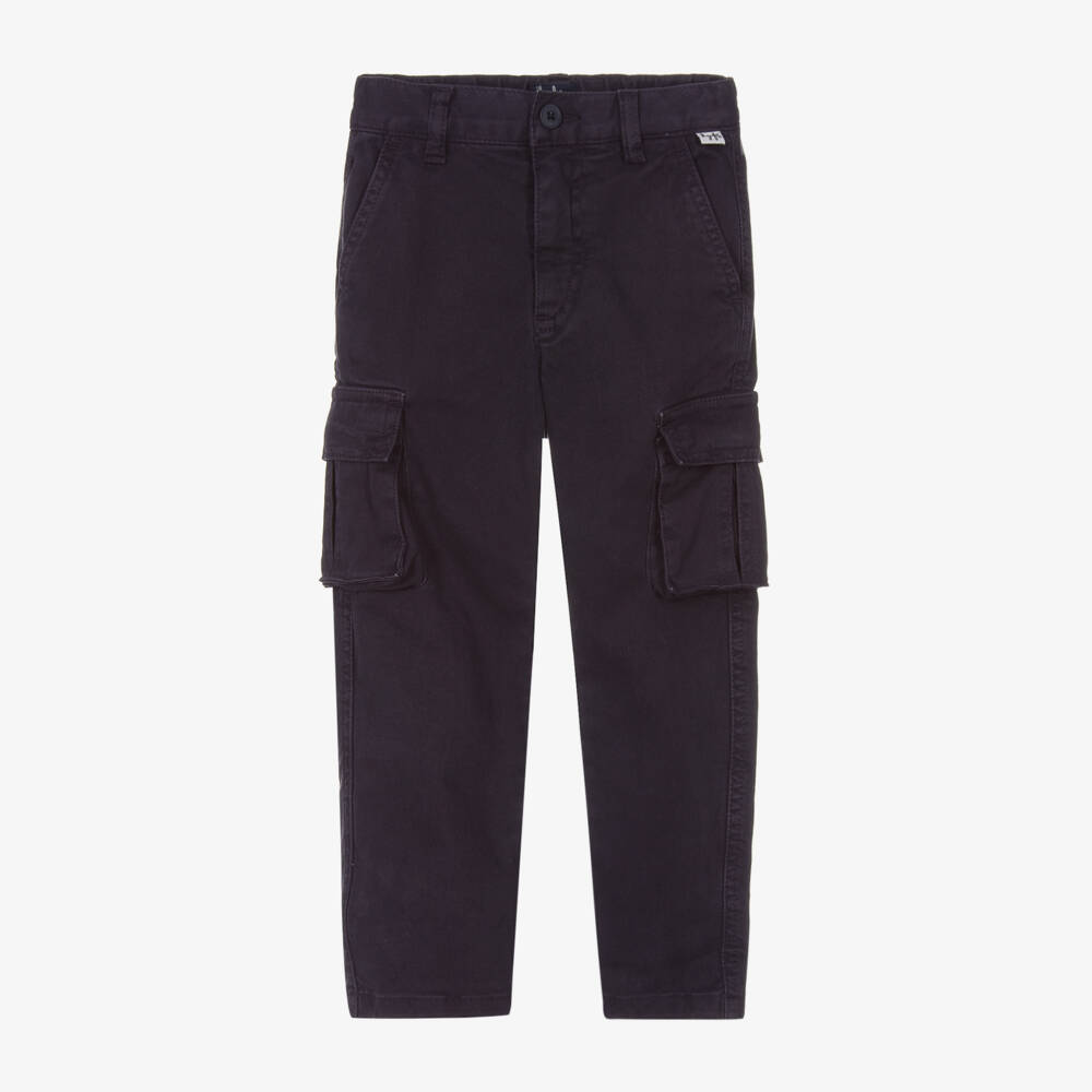 Casual navy blue cargo trousers for boys by luxury Italian brand Il Gufo. They are made in soft twill, with a hint of stretch for comfort. They have two slanted pockets at the hips, one slip pocket on the back, and two buttoned flap pockets on the legs. The waistband is adjustable for a good fit and they fasten with a button and a zip.